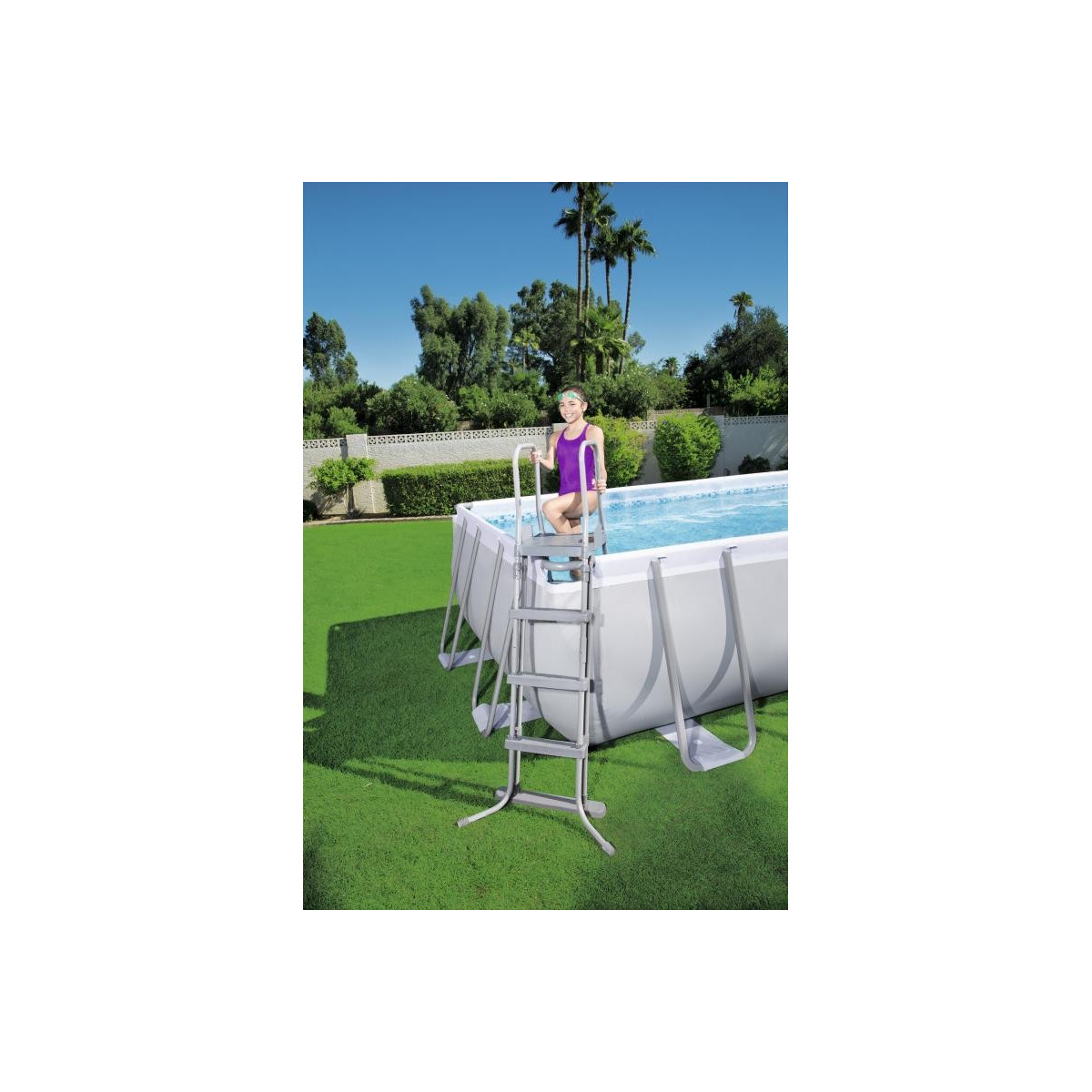 - Žebřík namontovaný na kovovém rámu usnadňuje vstup a výstup z bazénu.