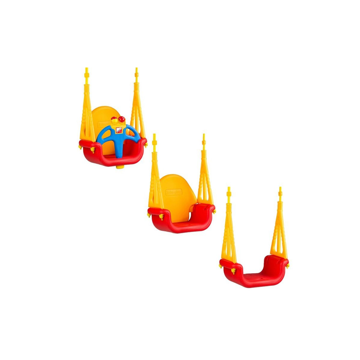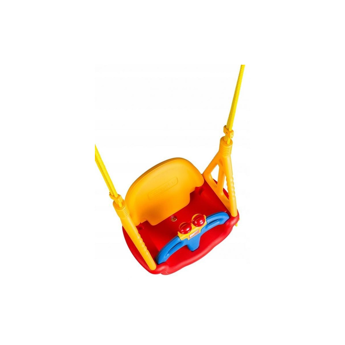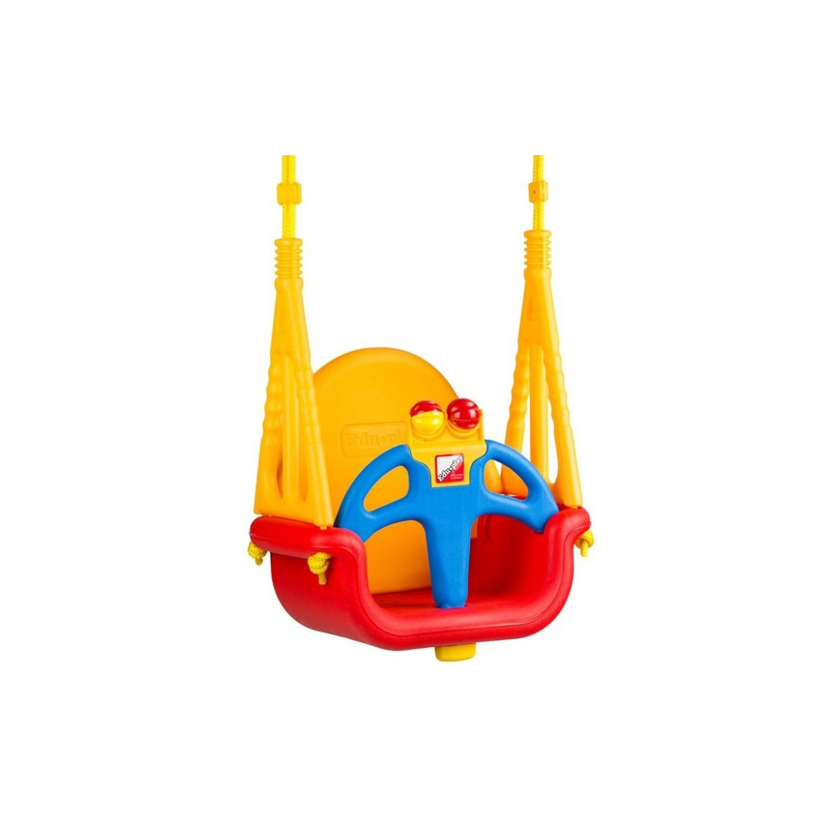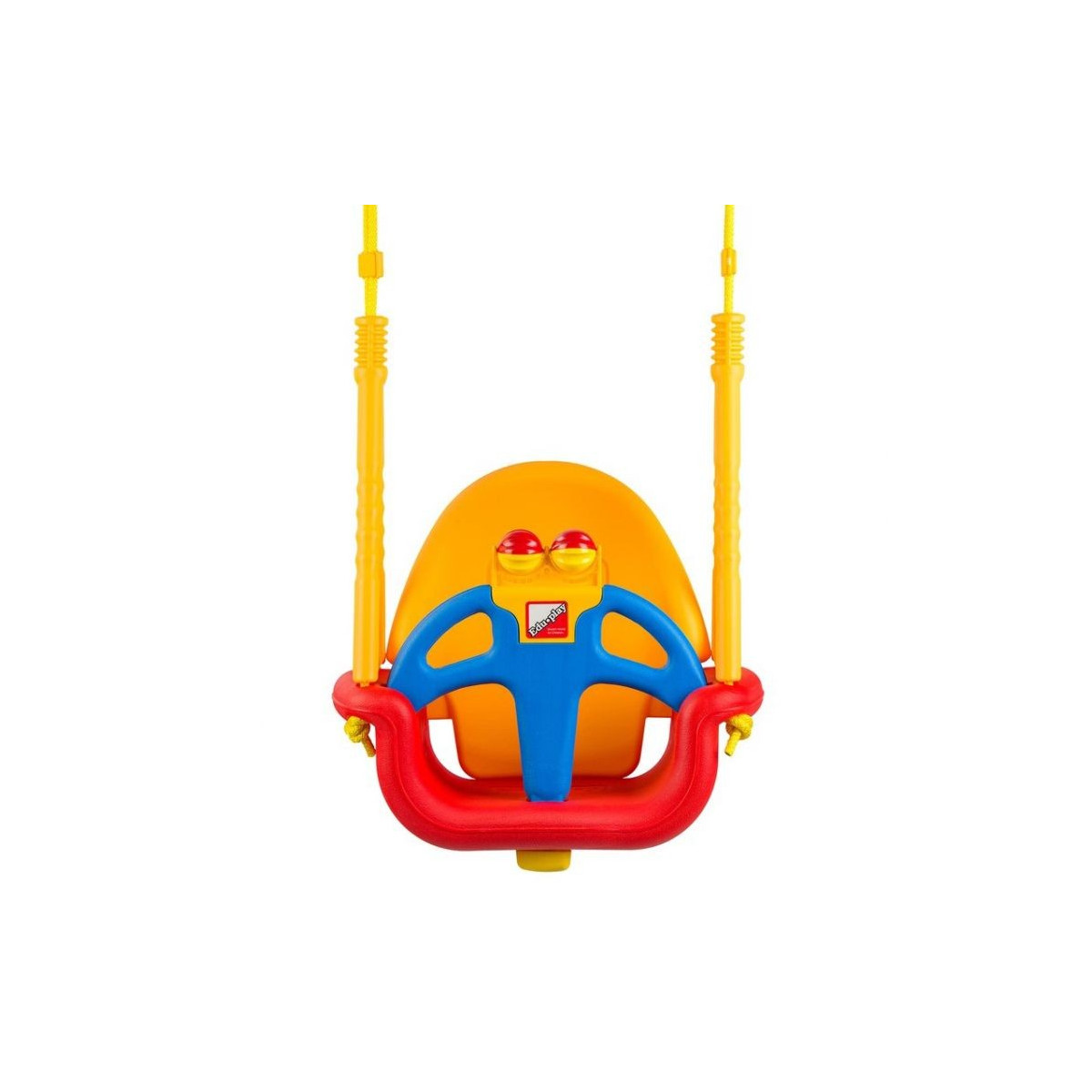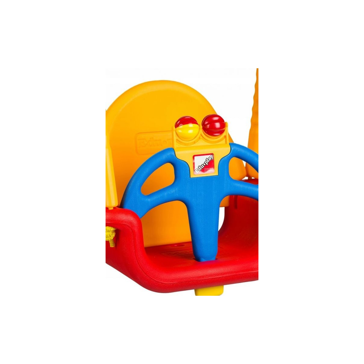 Houpací sedačka je vyrobena z kvalitních materiálů, díky čemuž je odolná vůči povětrnostním vlivům. Konstrukce je přizpůsobena ke změně jejích funkcí: houpací košík s jištěním, houpací sedačka s opěrkou, houpací sedačka jen se sedákem. Upevňovací lana (asi 130 cm) houpací sedačky jsou délkově nastavitelné a speciální závěsy po stranách hračky chrání dětské ručičky.