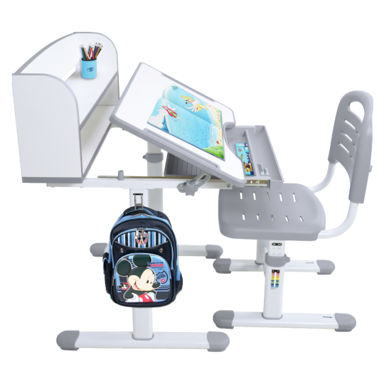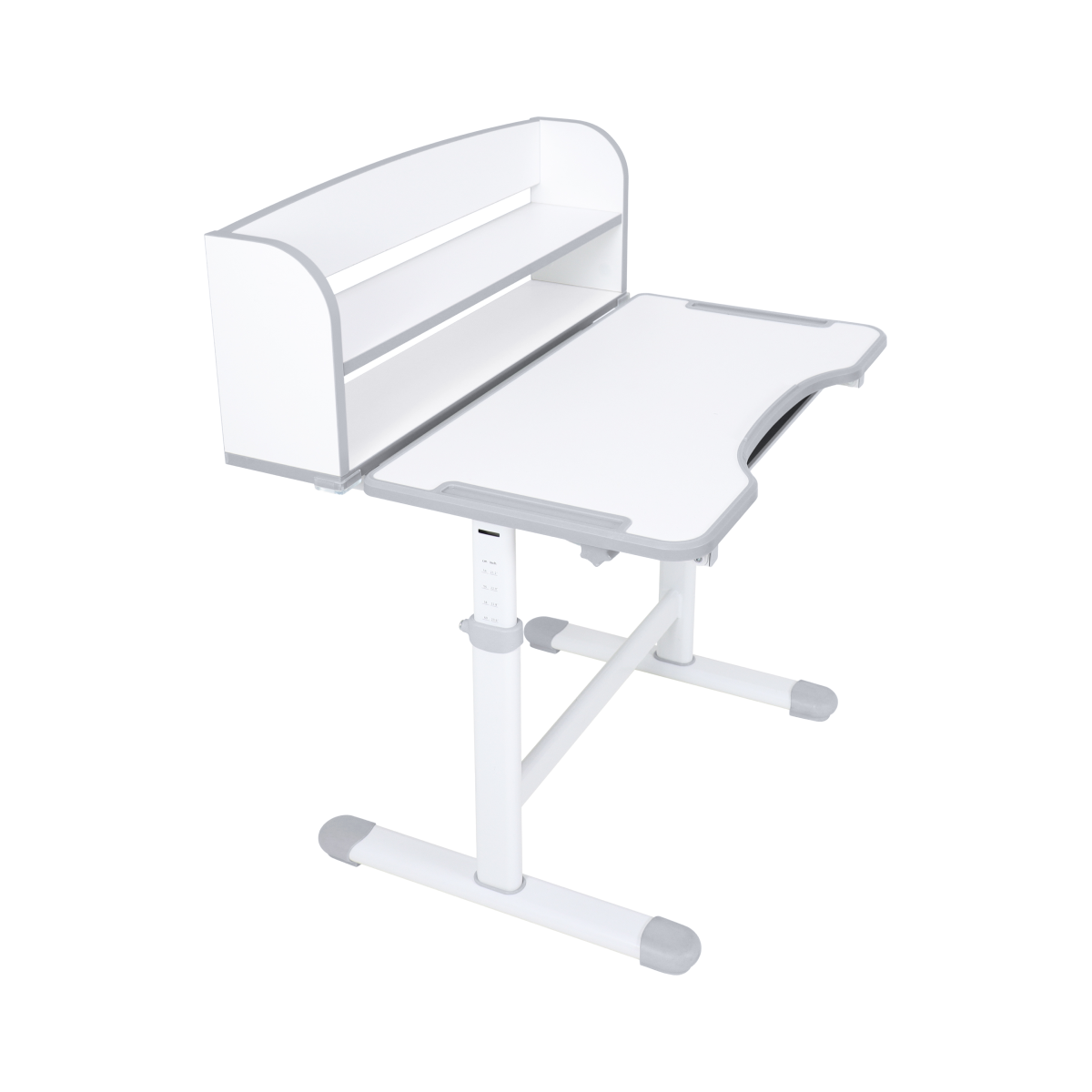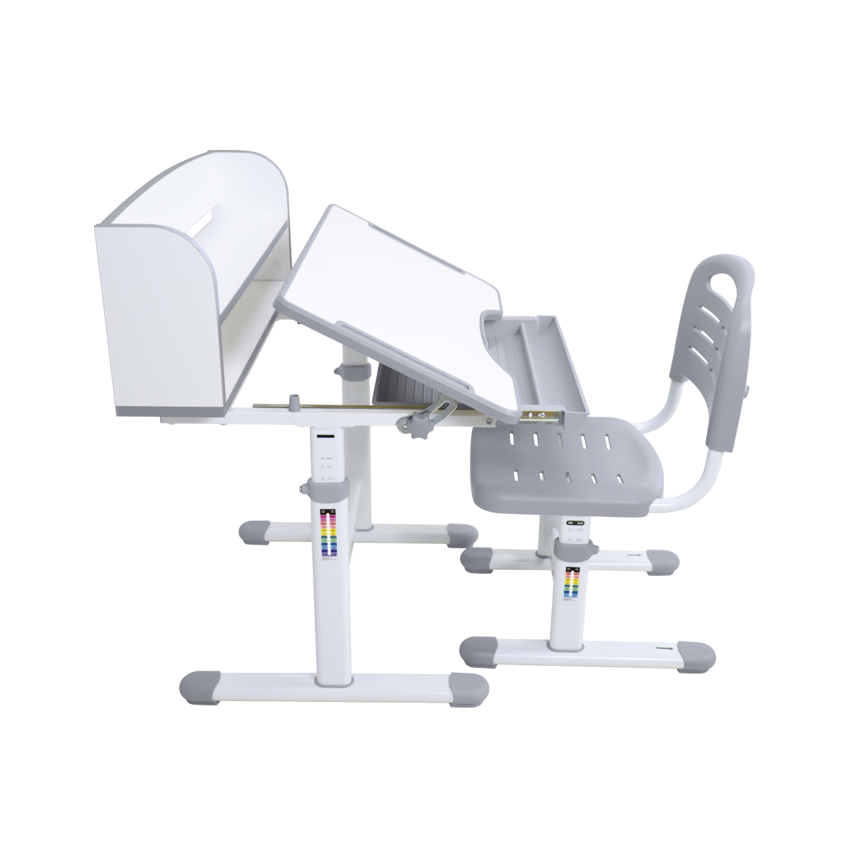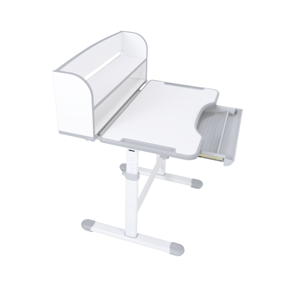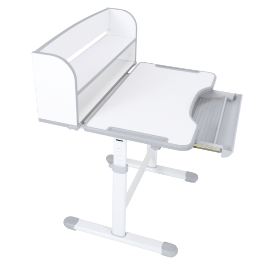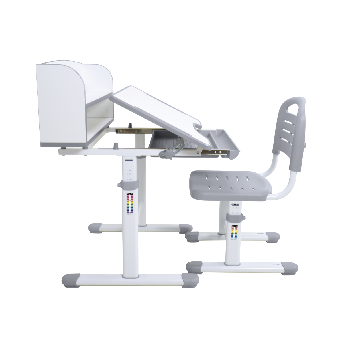 Stůl umožňuje nastavení výšky i sklonu desky až do 40°, což zvyšuje komfort při psaní, čtení i kreslení. Nechybí praktické přihrádky, zásuvka a police na uskladnění školních potřeb či knih.