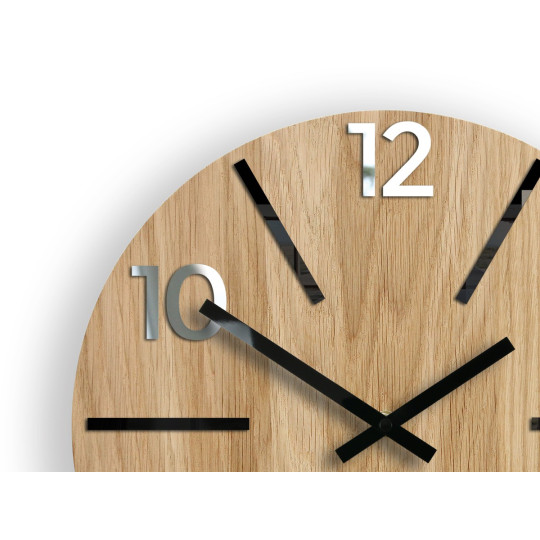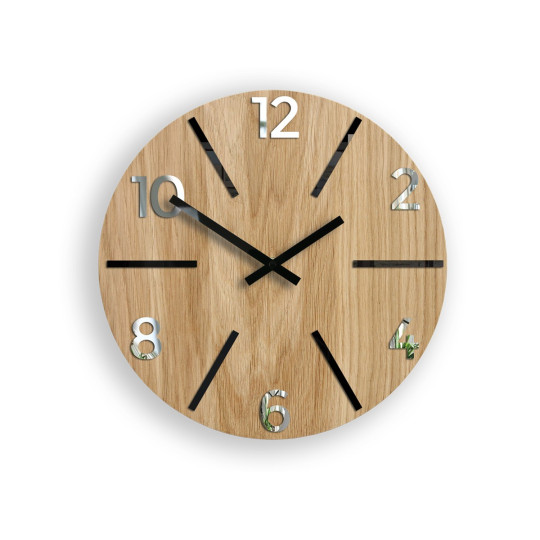 Dřevěné hodiny s dubovým ciferníkem s černými číslicemi a stříbrným zrcadlem .. Jejich jednoduchost a krása uchvátí každého, kdo se na ně podívá. Originální dekorace do obývacího pokoje, kanceláře, hezký tip na dárek. Hodiny jsou zabalené v elegantní krabičce.