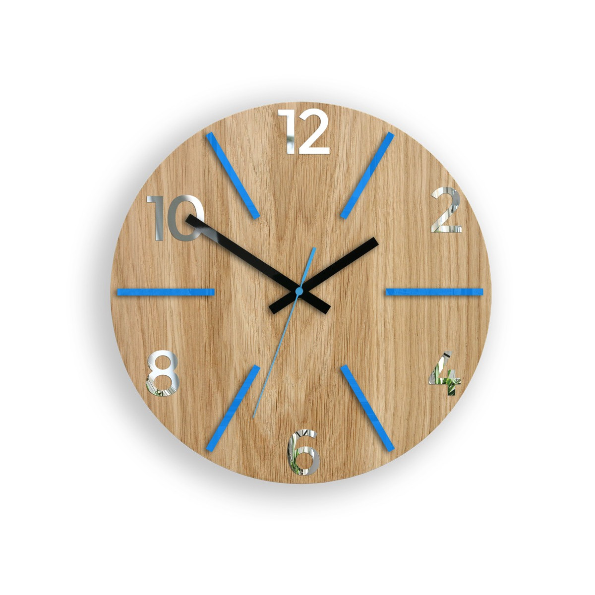 Dřevěné hodiny s dubovým ciferníkem se stříbrnými zrcadlovými číslicemi a modrými indexy. Jeho jednoduchost a krása uchvátí každého, kdo se na něho podívá. Originální dekorace do obývacího pokoje, kanceláře a je to pěkný tip na dárek. Hodiny jsou zabalené v elegantní krabičce.