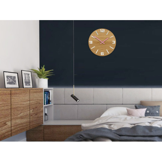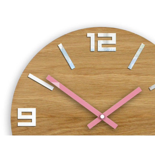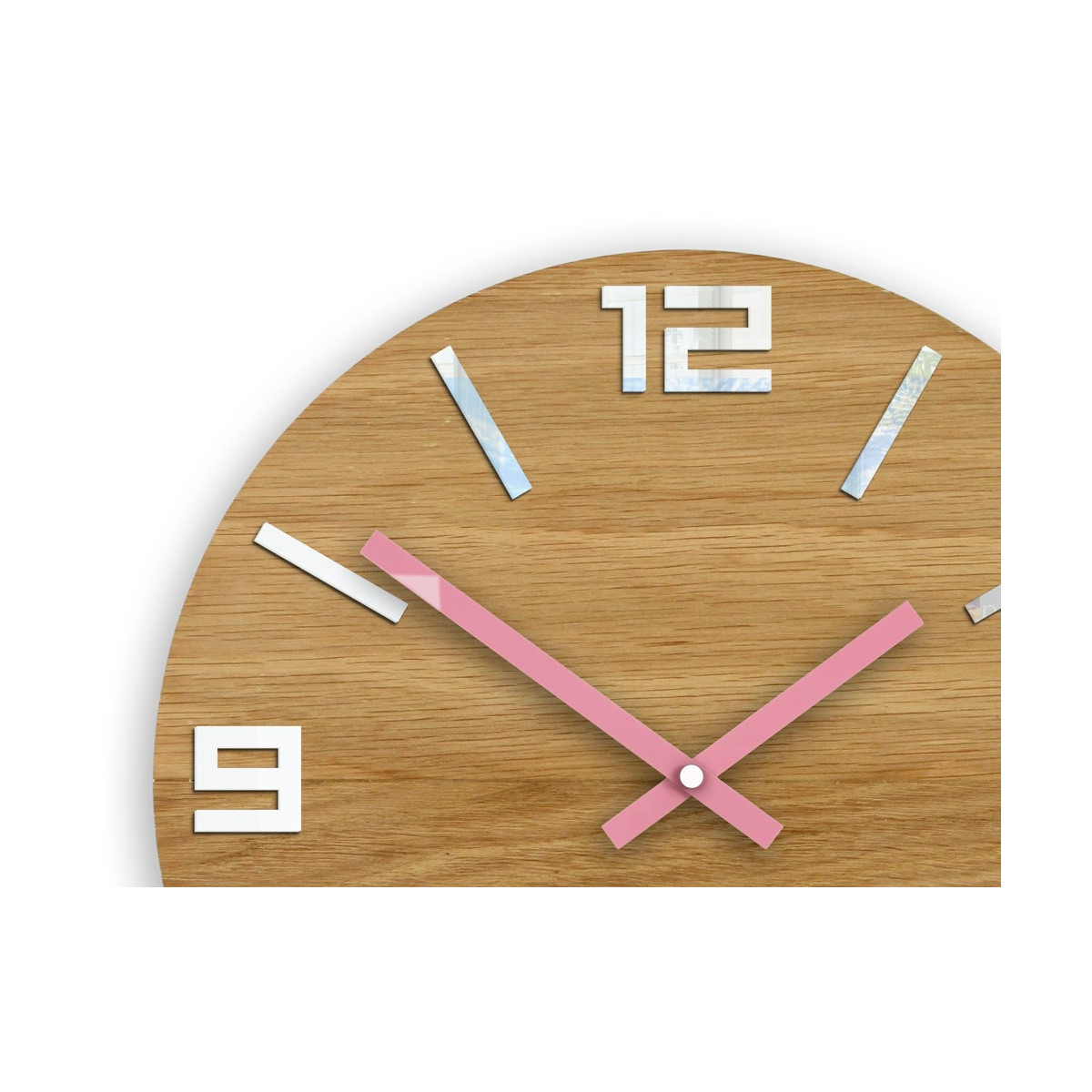 Nástěnné hodiny jsou vyrobeny ze 3mm dubového dřeva a 10mm mdf desky, zdobené ručičkami v krásné živé barvě, což jim dodává velmi elegantní a šik charakter. Na druhé straně dřevěné hodiny, dnes tak módní a ochotně zvolené, odkazují na přírodu a skandinávský styl.