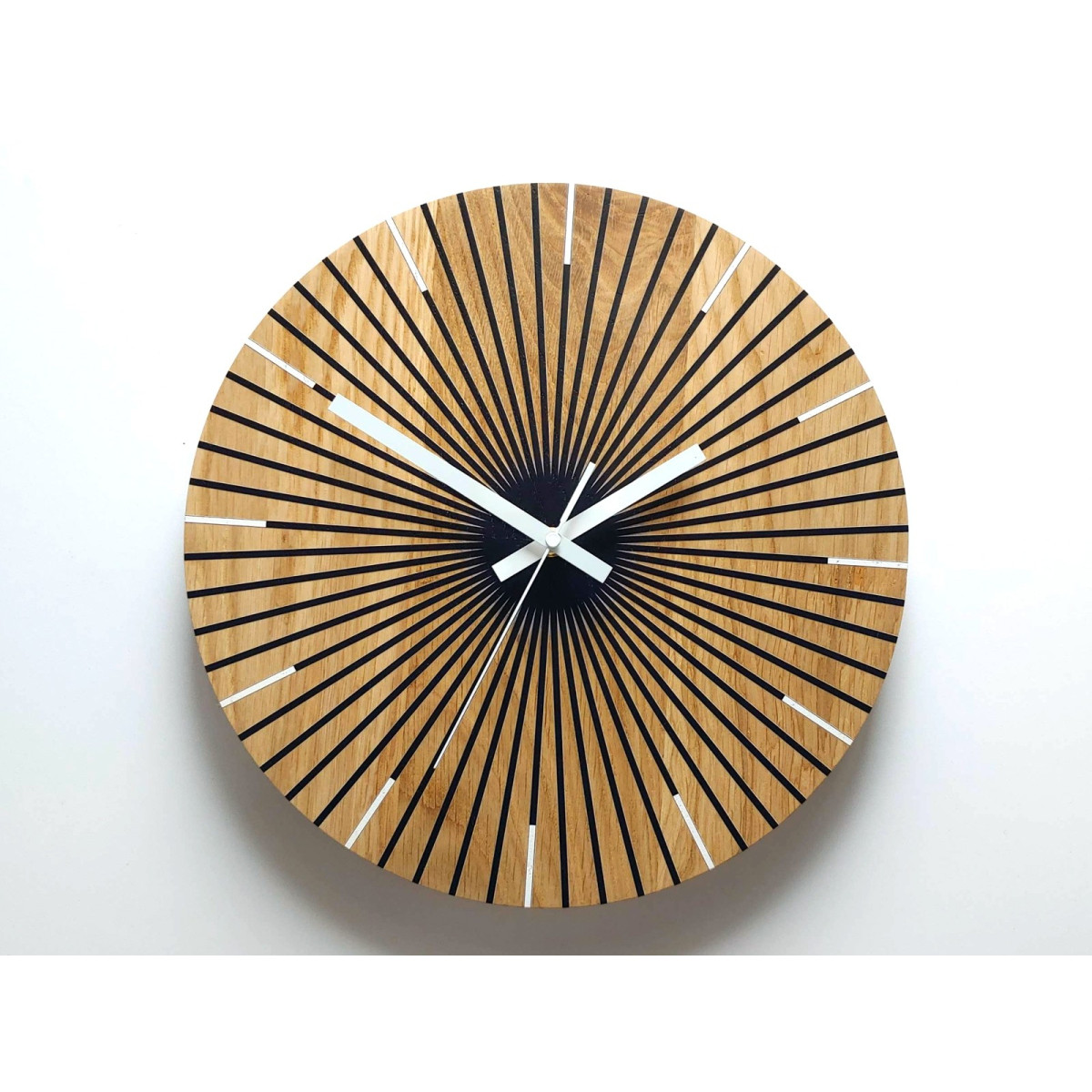 Hodiny jsou vyrobeny ze 100% přírodního dubu a MDF desky. Vrstva ciferníku je 100% dubová - proto žádné dvě hodiny nejsou stejné. Zrnitost dřeva je u každých hodin jiná. Hodiny jsou napuštěny přírodním včelím voskem se přidáním zajímavé grafiky.