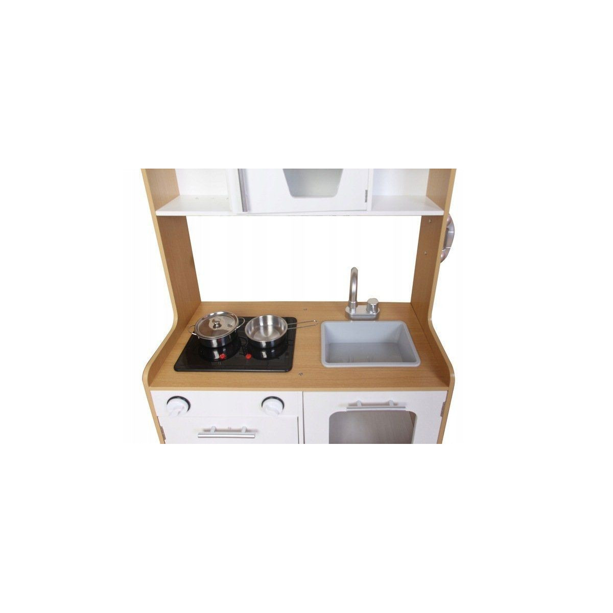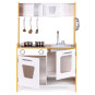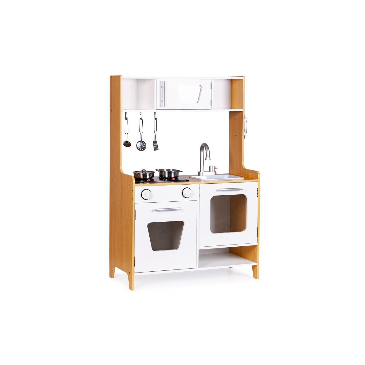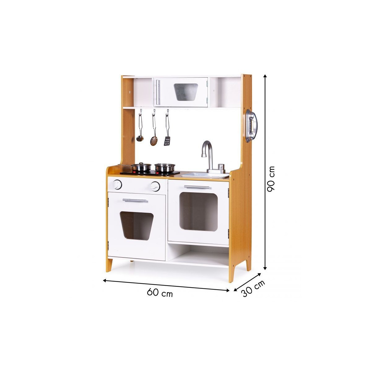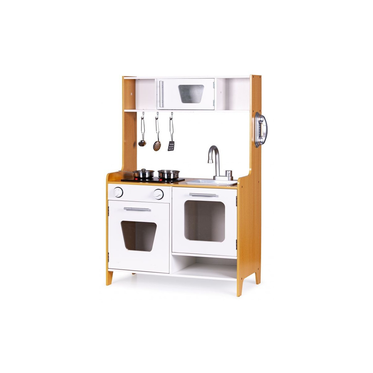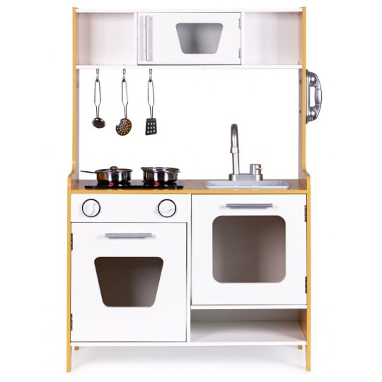 Dřevěná kuchyňka s velkými rozměry bude jako stvořená pro děti, které rády vaří. Sporák má otvírací troubu a velkou otvírací skříň. Na vrchní straně hračky je hořák, který svítí a vydává zvuk vařící vody. V kuchyni jsou také dva knoflíky, baterie s umyvadlem, telefon a malá skříňka s policemi v horní části. Součástí kuchyňky je 5 kovových doplňků. Hračka bez ostrých hran - 100% bezpečná pro dítě.