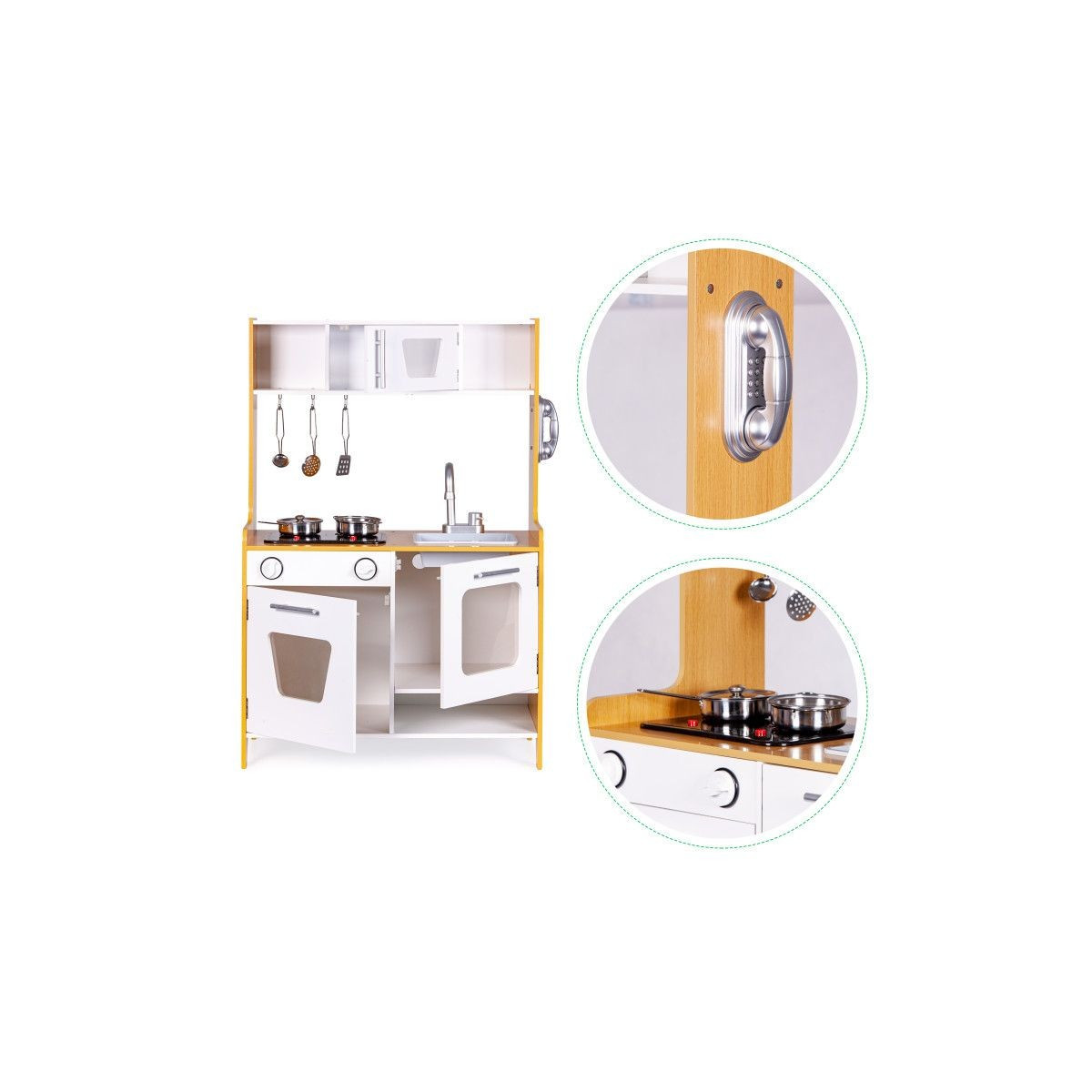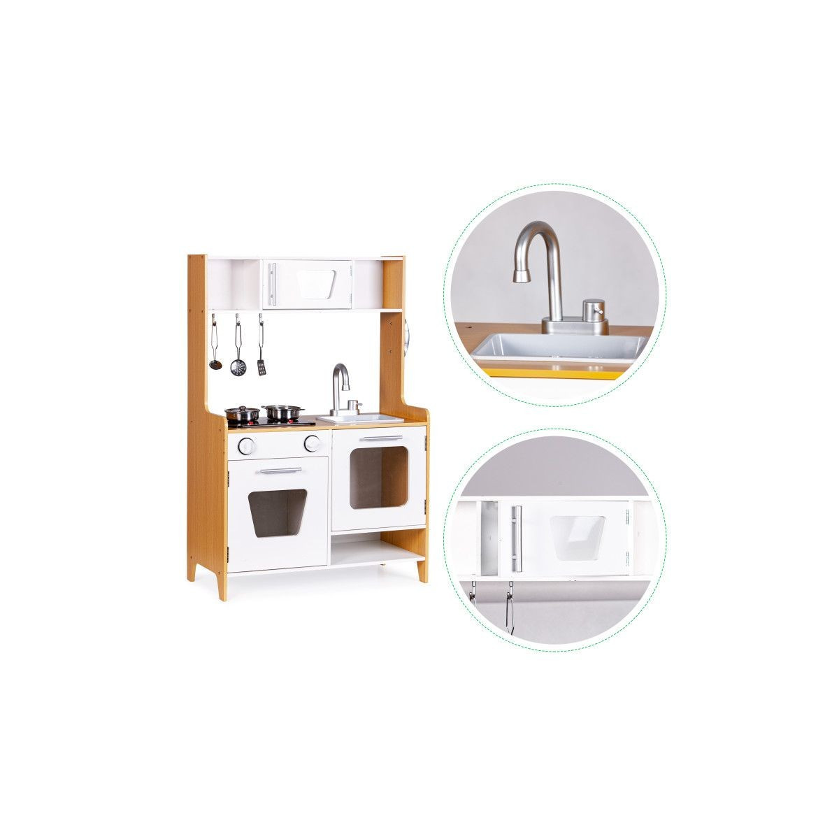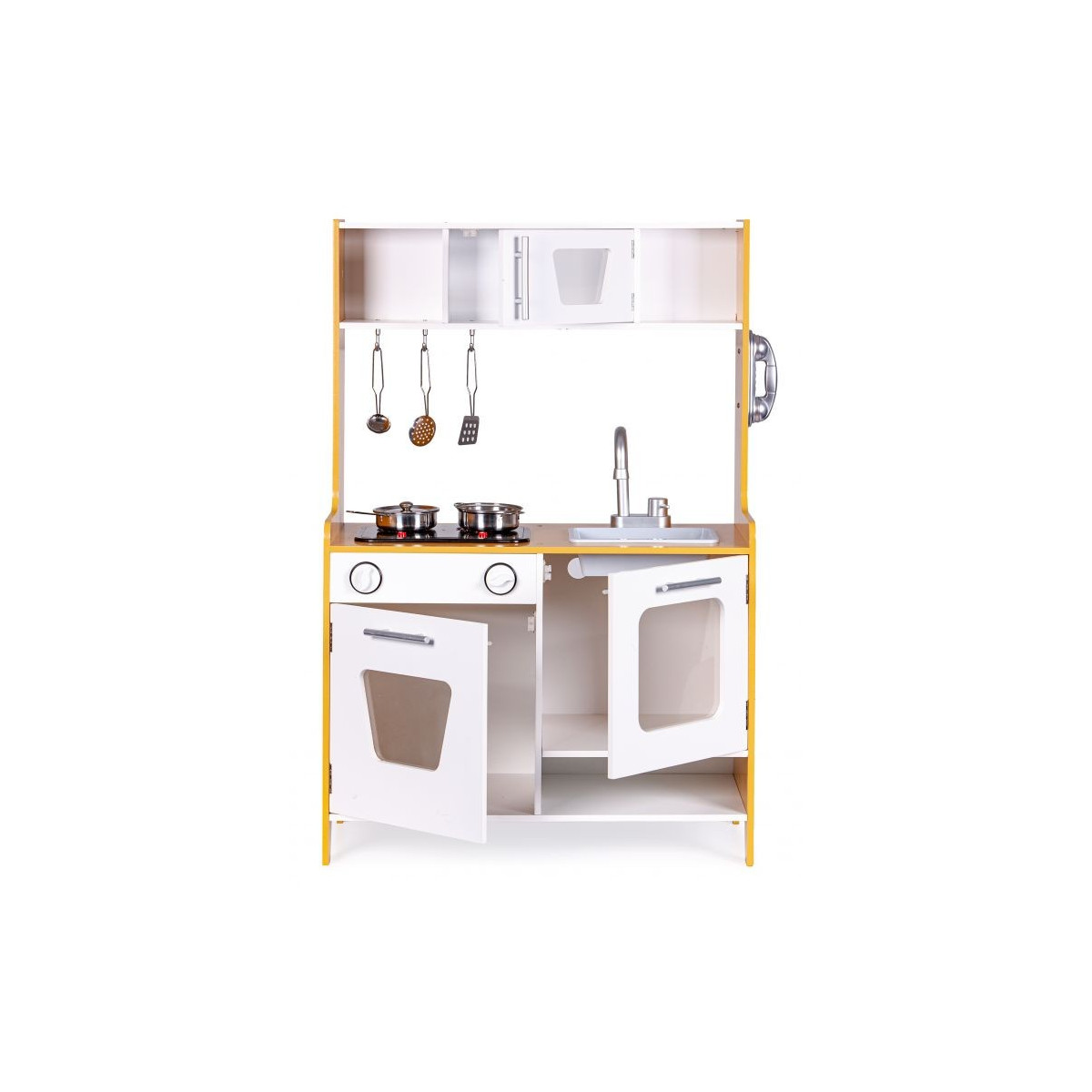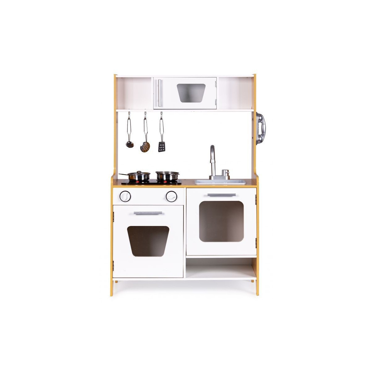 Dřevěná kuchyňka s velkými rozměry bude jako stvořená pro děti, které rády vaří. Sporák má otvírací troubu a velkou otvírací skříň. Na vrchní straně hračky je hořák, který svítí a vydává zvuk vařící vody. V kuchyni jsou také dva knoflíky, baterie s umyvadlem, telefon a malá skříňka s policemi v horní části. Součástí kuchyňky je 5 kovových doplňků. Hračka bez ostrých hran - 100% bezpečná pro dítě.