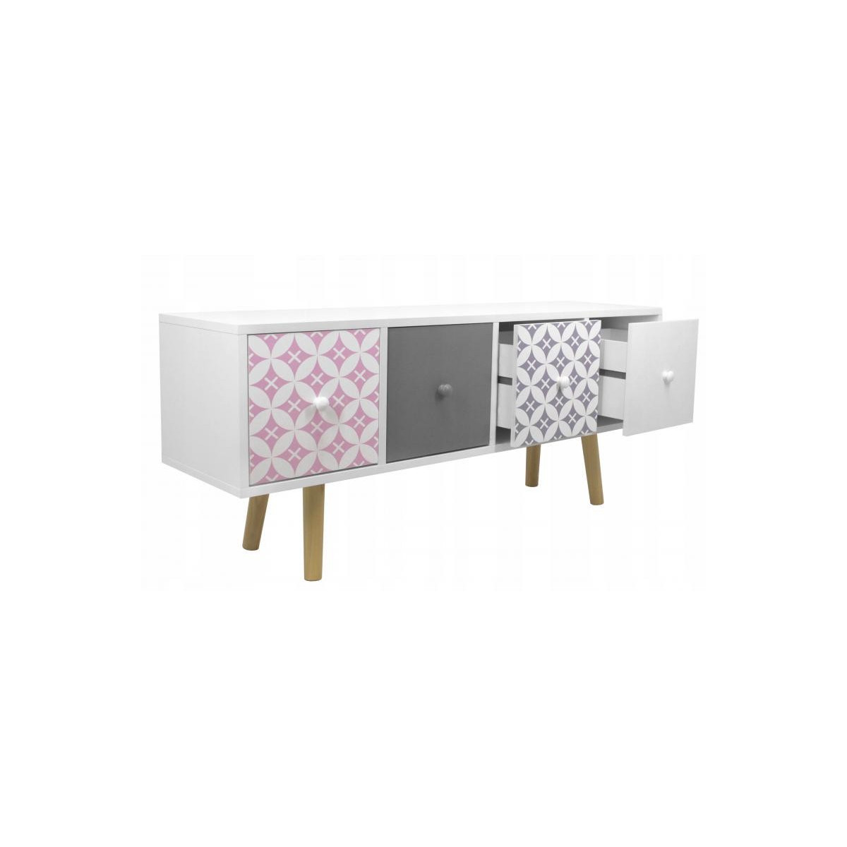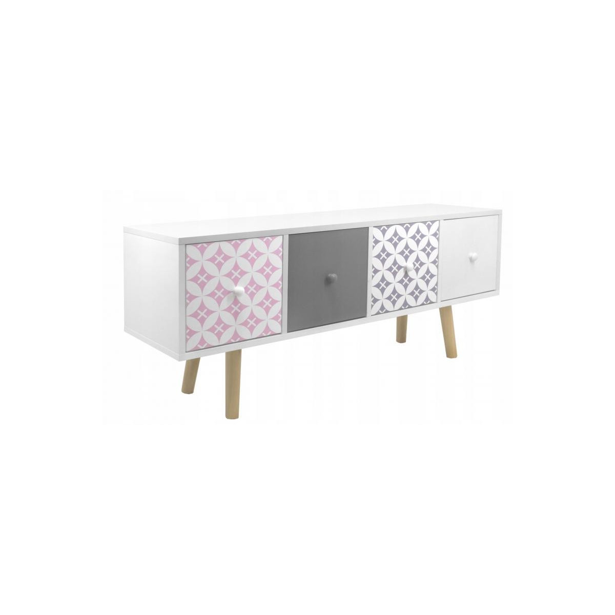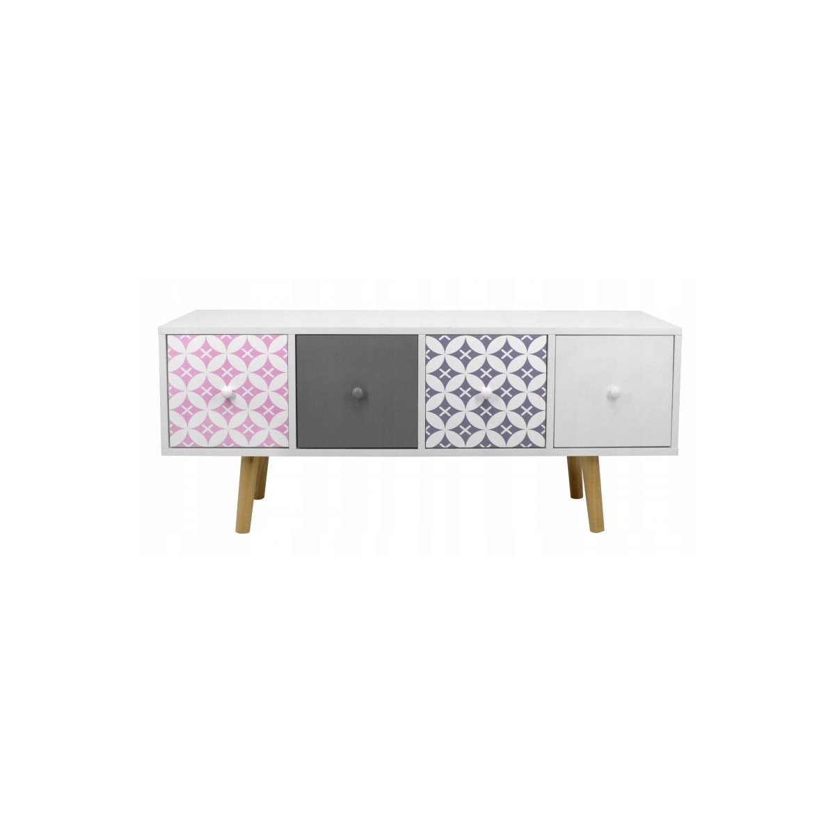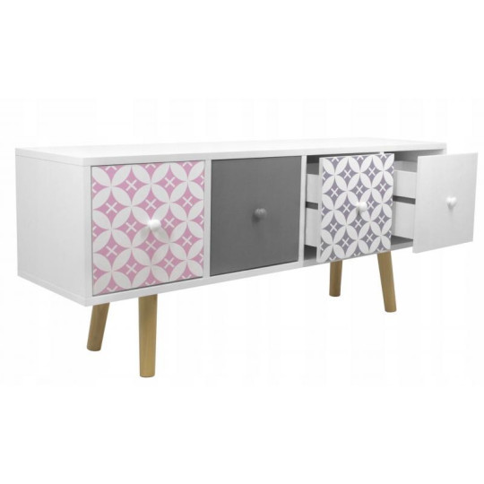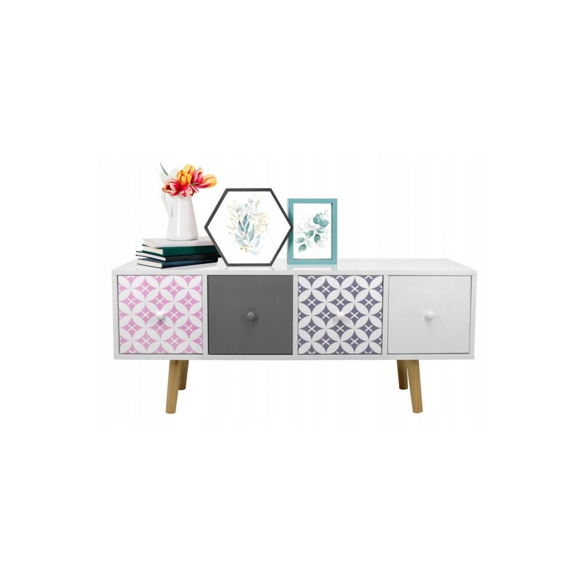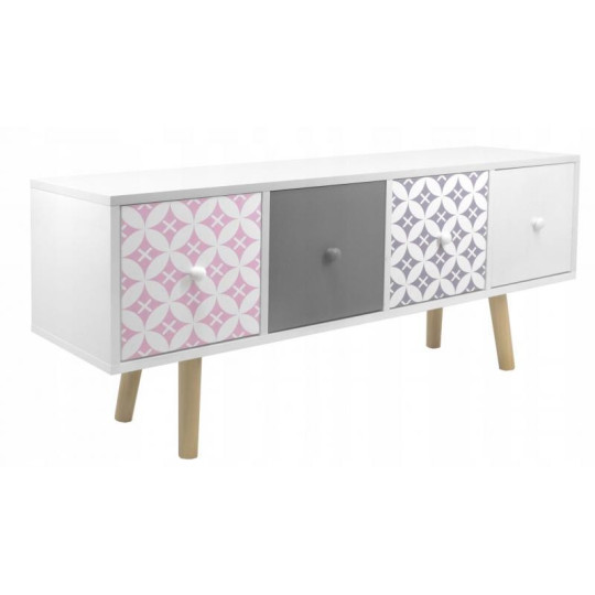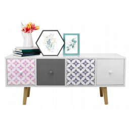 Komoda s šuplíky je dokonalým řešením, jak udělat váš domov fenomenálně krásným a velmi moderním. Komoda zůstala v pestrých barvách a kontrast k bílé dodávají šedé, růžové a modré čela šuplíků. 4 dekorativní šuplíky dokonale ladí se stylem Shabby Chic. Vejdou se do nich všechny nejpotřebnější věci, čímž se vytvoří další prostor pro vaši místnost.