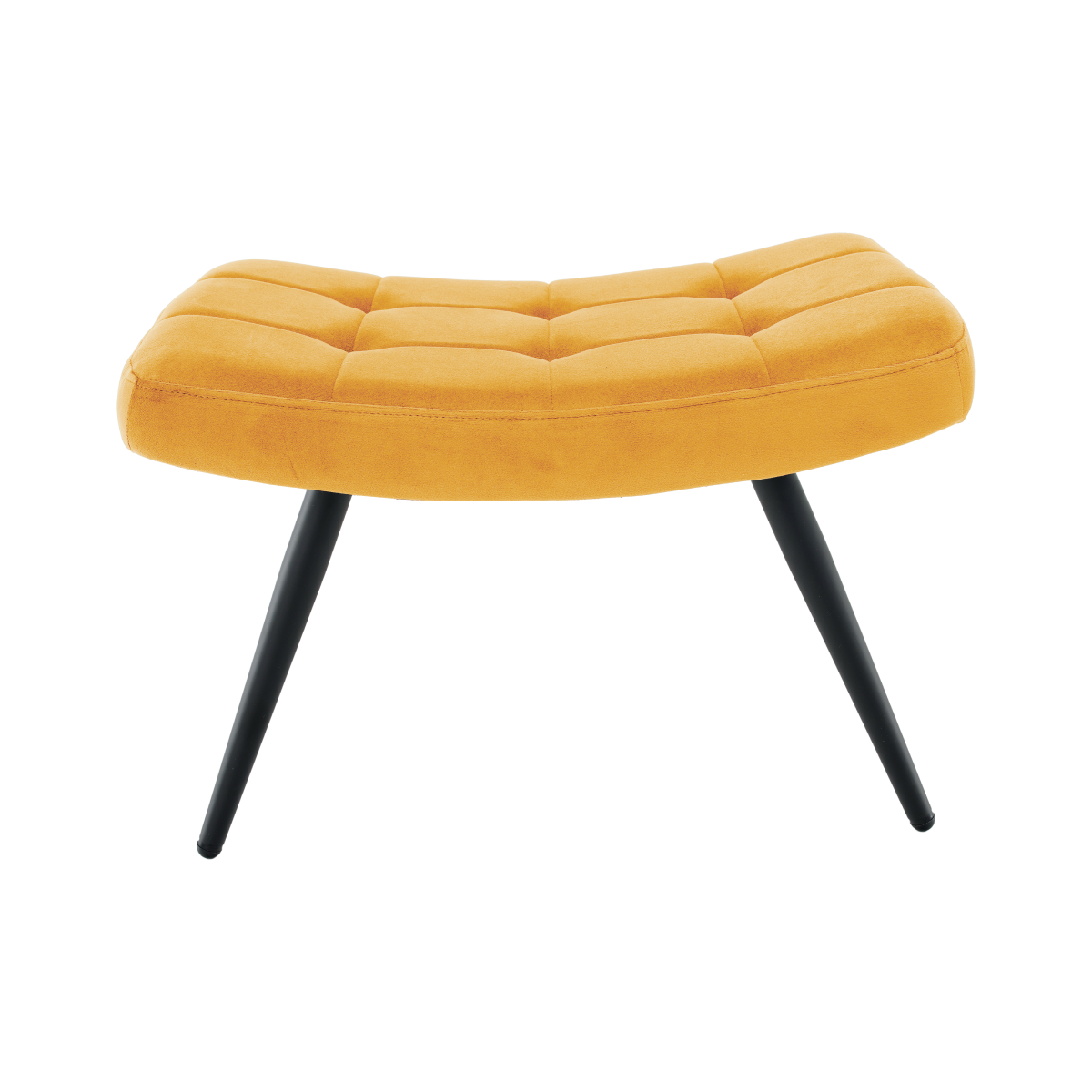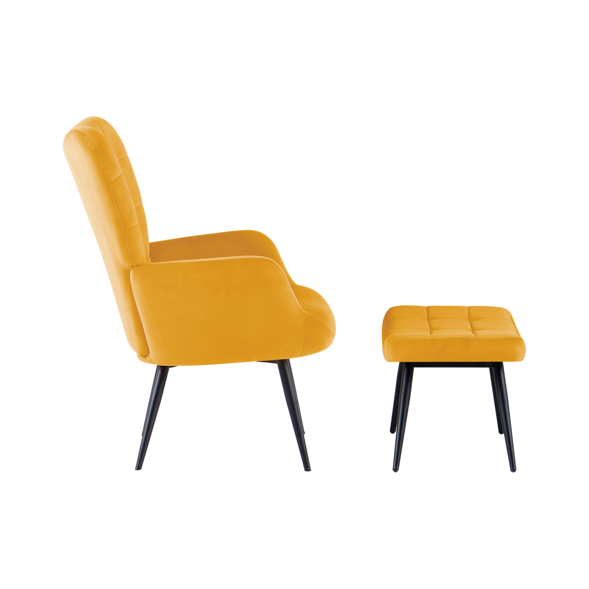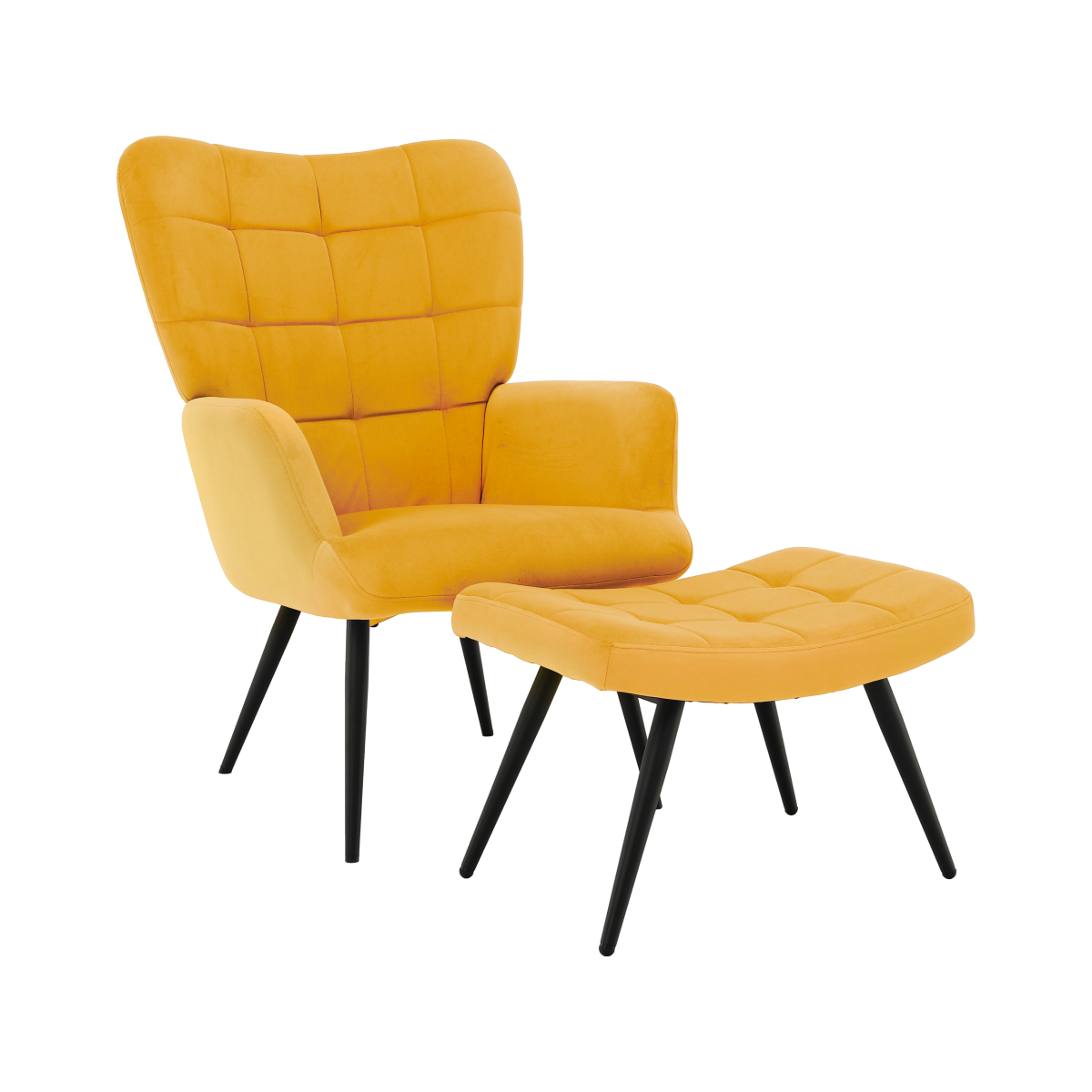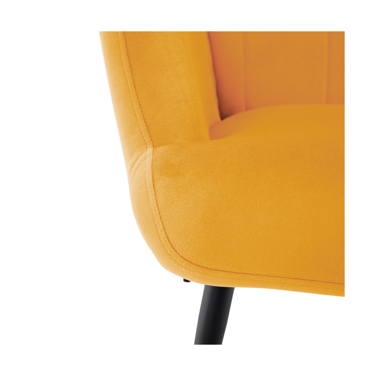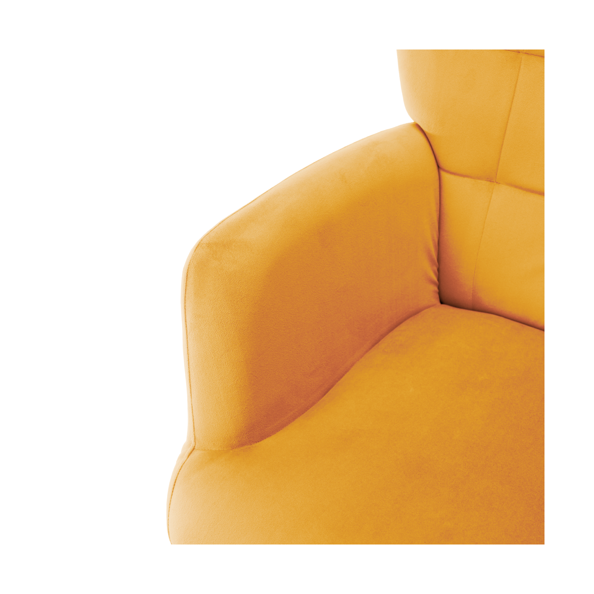 Elegantní křeslo HABEN se stylovým podnožím přinese do vašeho interiéru kombinaci komfortu a moderního designu. Žlutá sametová látka Velvet spolu s černou kovovou konstrukcí vytváří nadčasový vzhled, zatímco prošívané detaily dodávají křeslu luxusní charakter. Ideální na relaxaci po náročném dni.