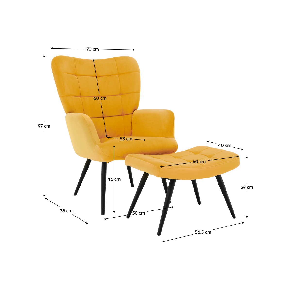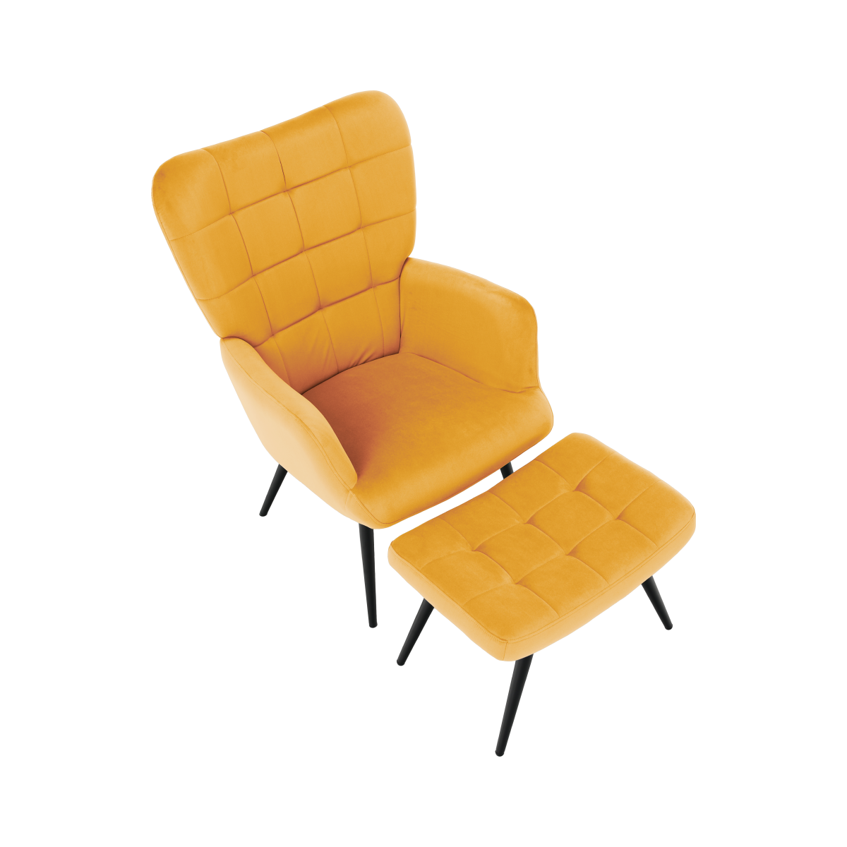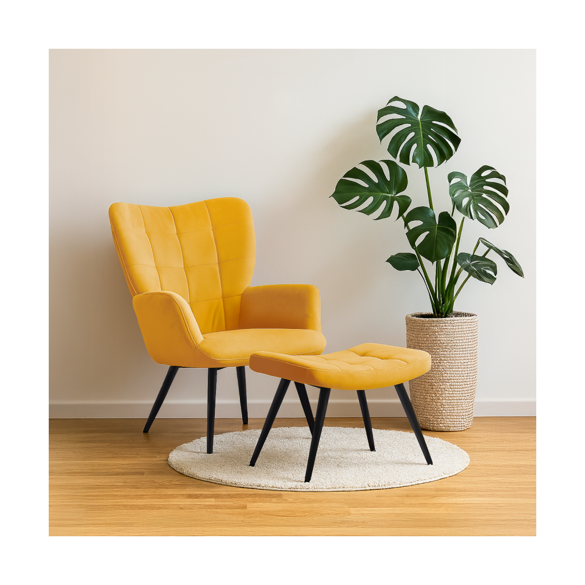 Křeslo s podnožkou HABEN je ideální volbou pro každého, kdo hledá pohodlí, styl a kvalitu v jednom. Díky kombinaci měkké sametové látky Velvet v žluté barvě a pevné černé kovové konstrukce působí elegantně a zároveň moderně.