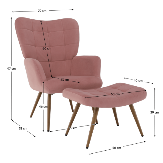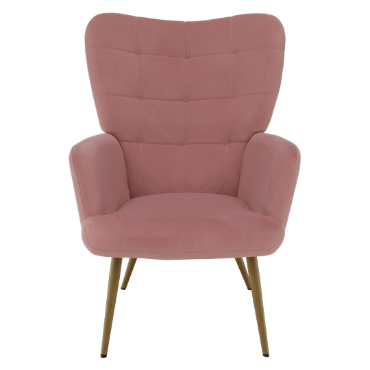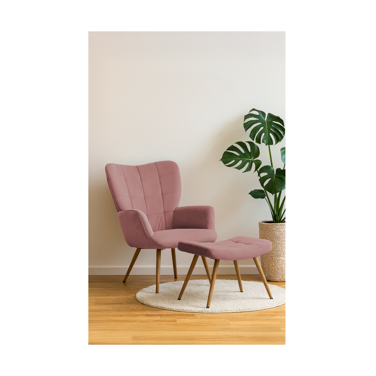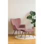 Křeslo s podnožkou HABEN je ideálním řešením pro každého, kdo hledá pohodlné a designově výrazné křeslo do interiéru. Sametová látka Velvet v jemném růžovém odstínu působí elegantně a zároveň útulně, díky čemuž se křeslo hodí do moderních i klasických prostor.