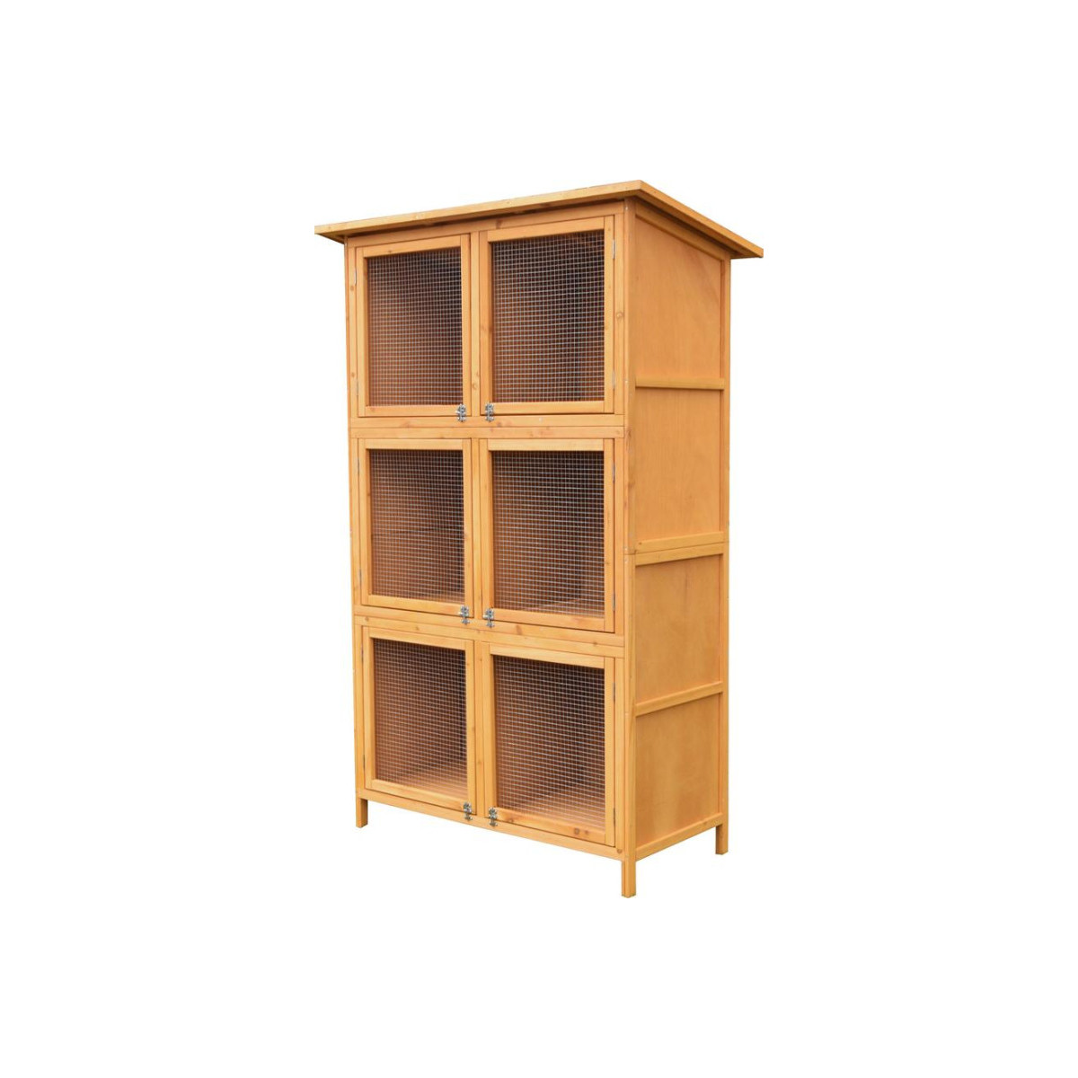 Pevný dřevěný rám zajišťuje stabilitu a dlouhou životnost konstrukce. Dveře s kovovým pletivem umožňují dostatečné větrání a zároveň poskytují bezpečnou ochranu. Otevíratelné dveře na každém patře zaručují pohodlný přístup při krmení, kontrole či čištění.