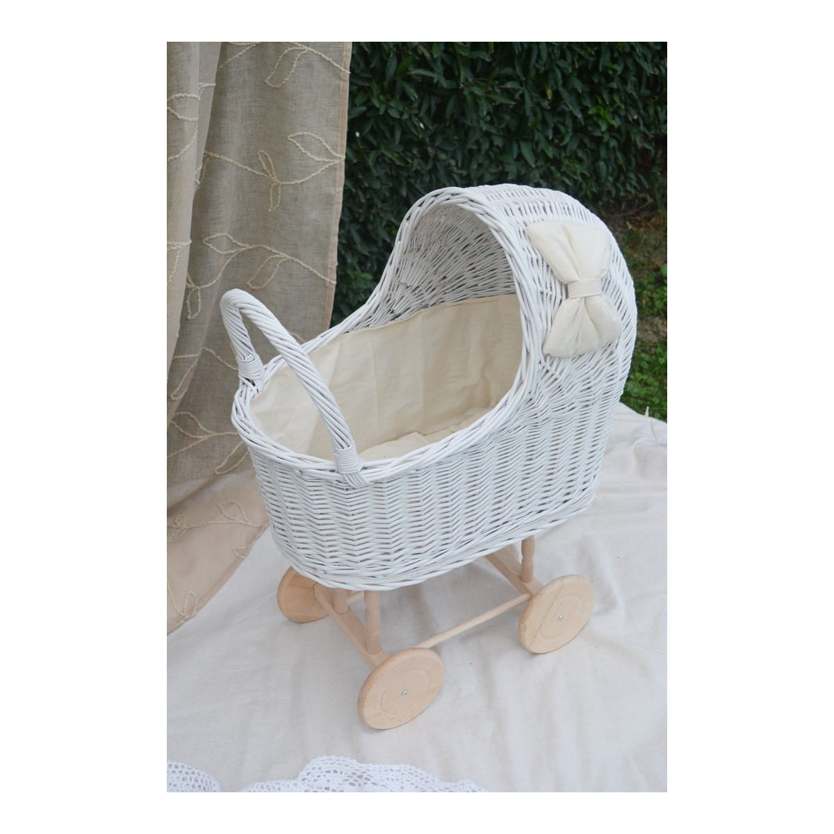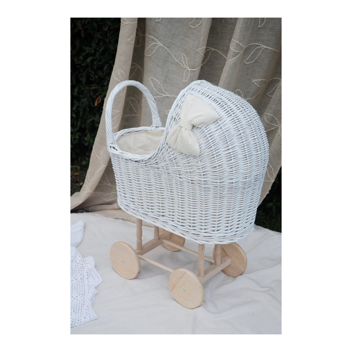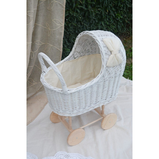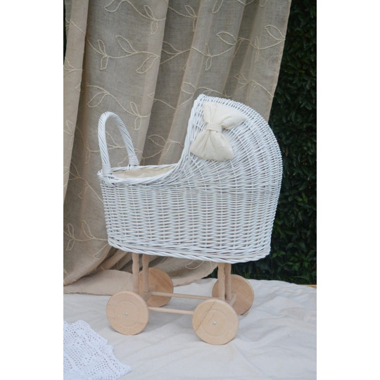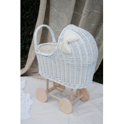 Krásný a jedinečný proutěný kočárek pro panenky.