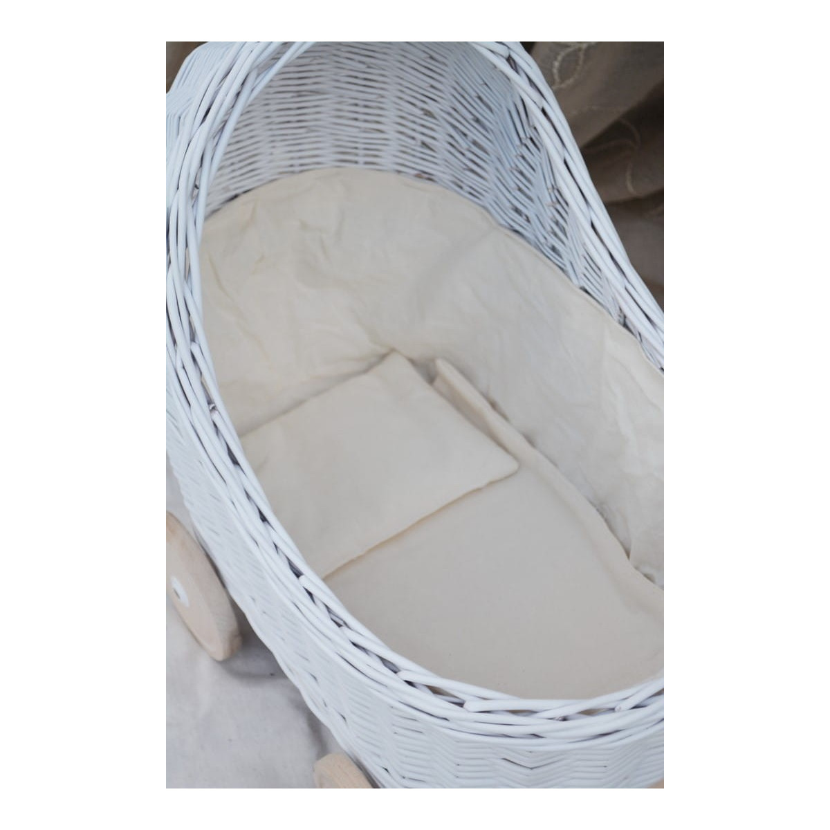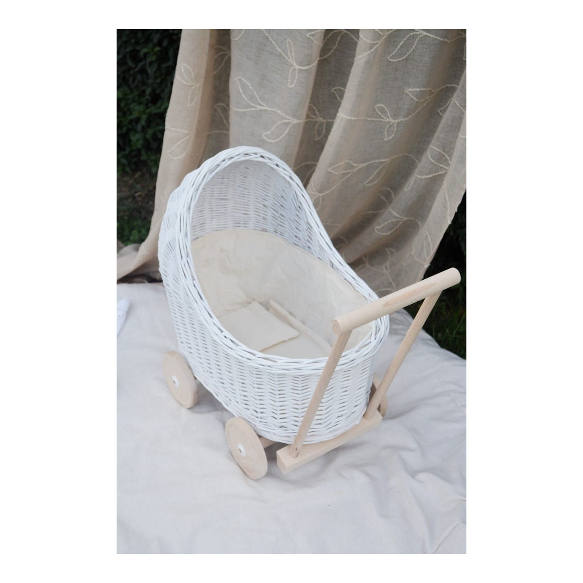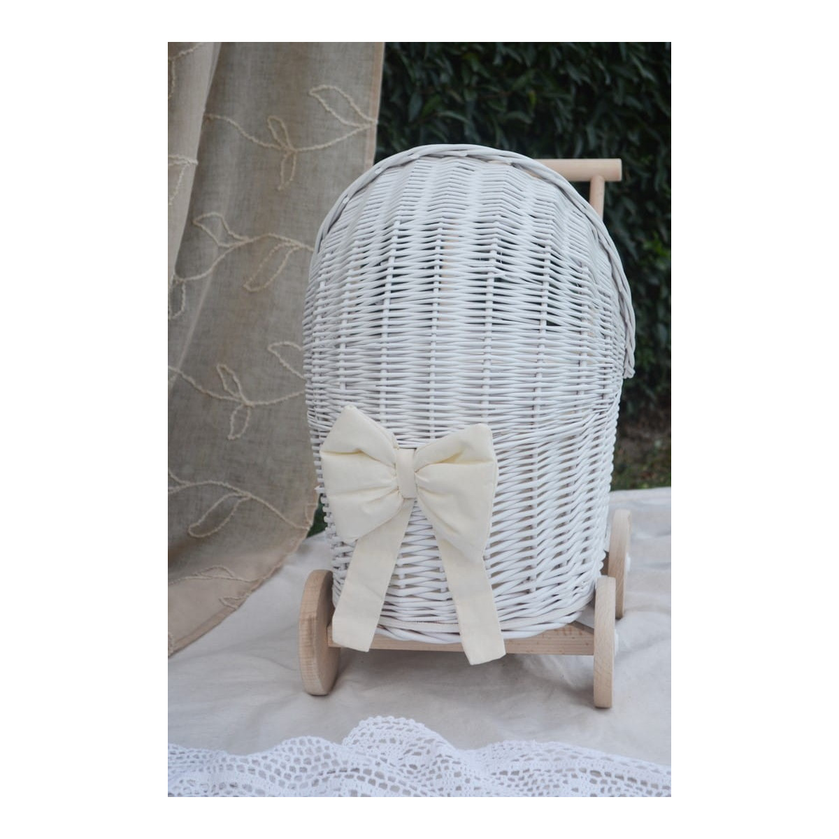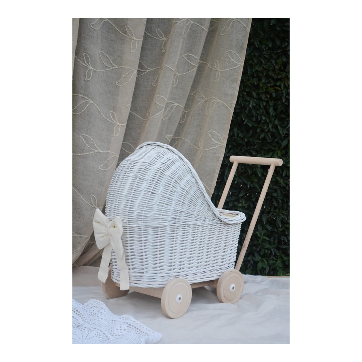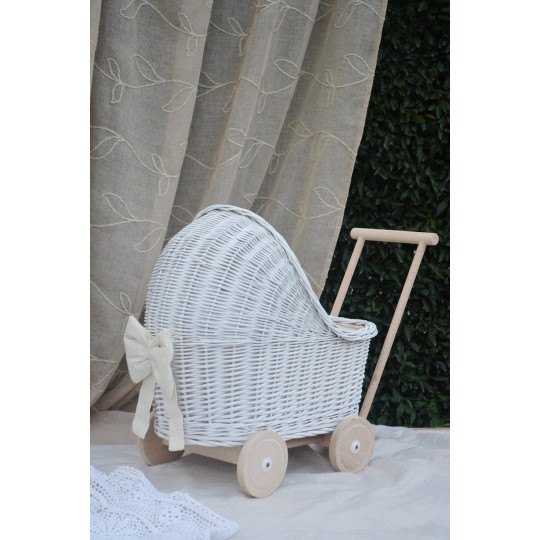 Krásný a jedinečný proutěný kočárek pro panenky.