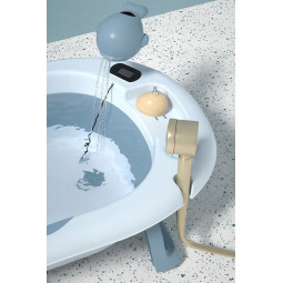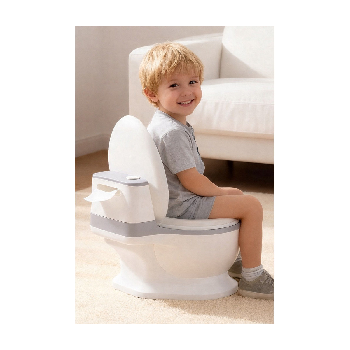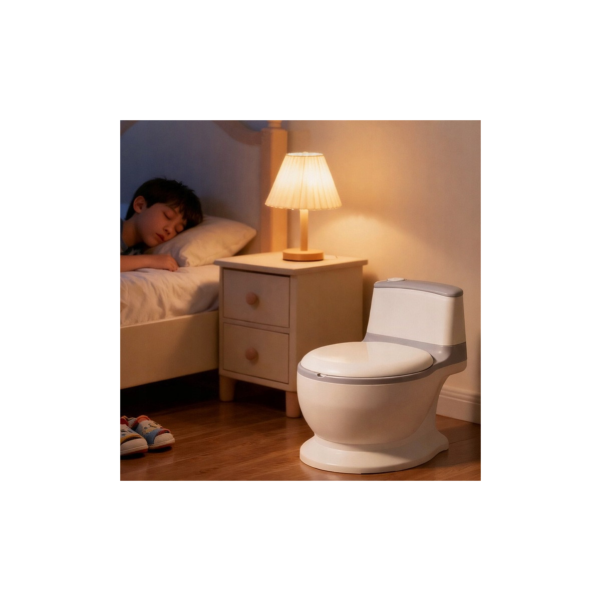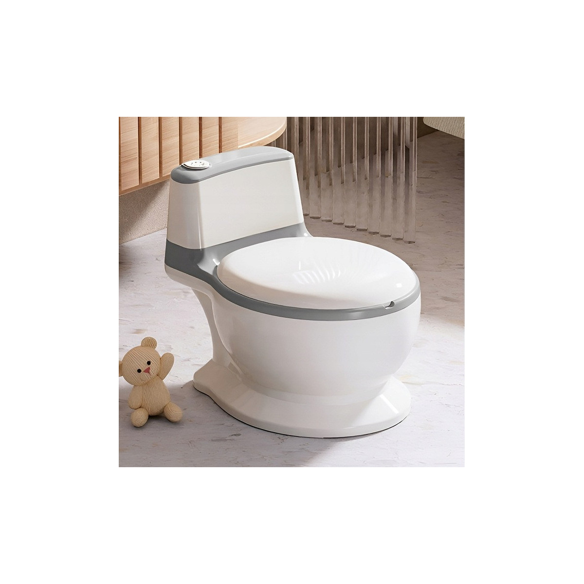 Nočník obsahuje tlačítko, které po stisknutí spustí realistický zvuk splachování vody.