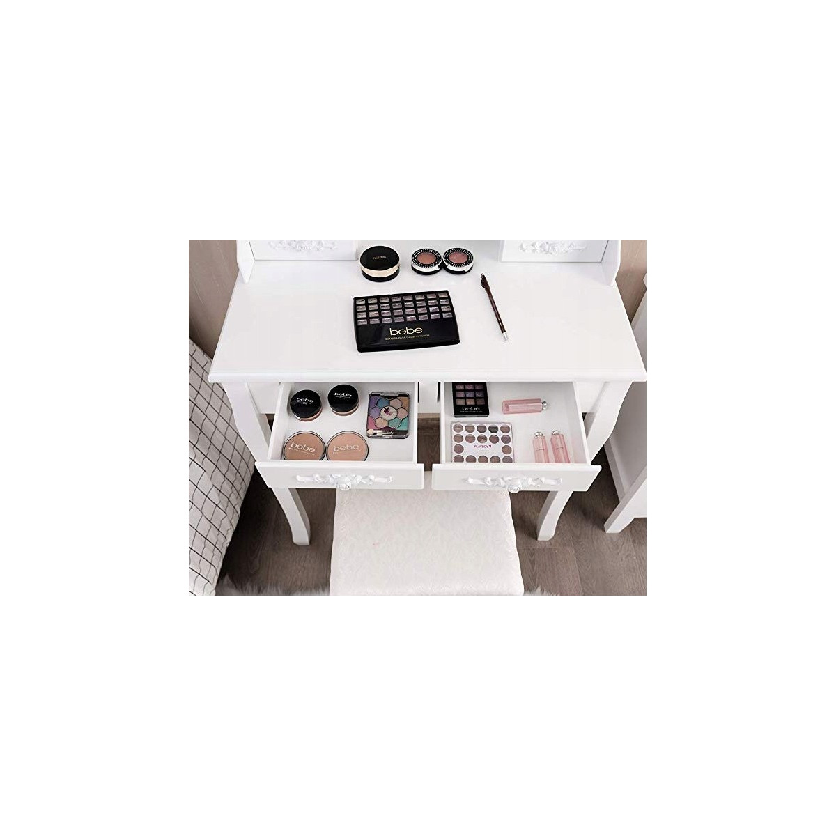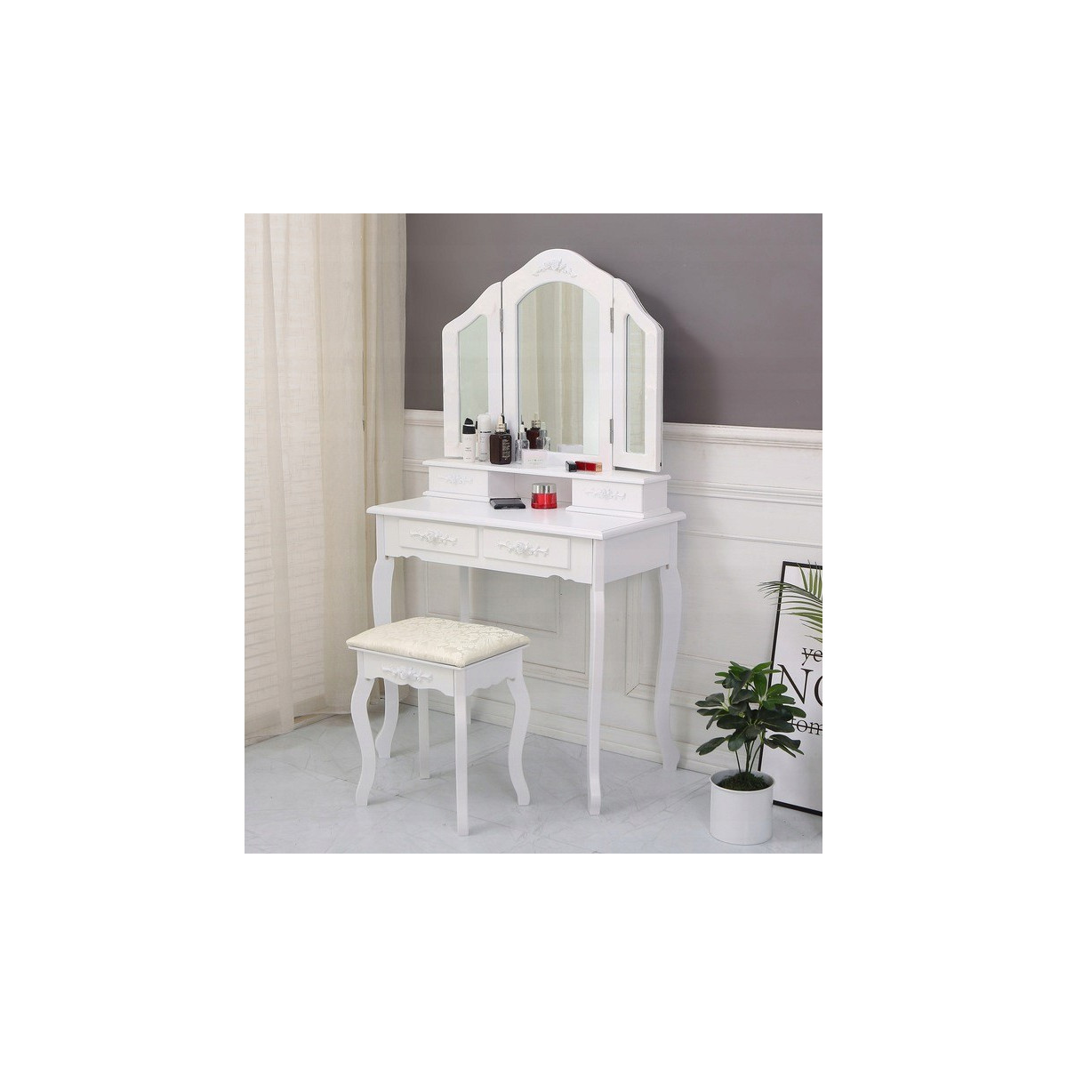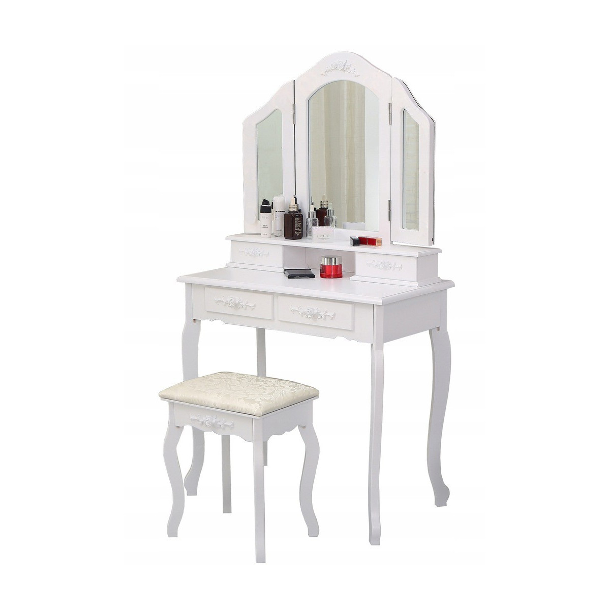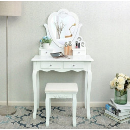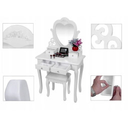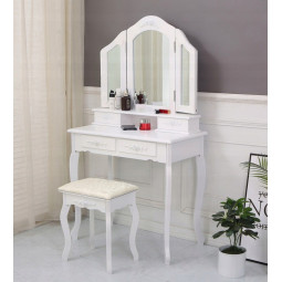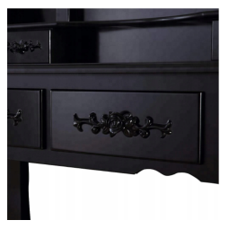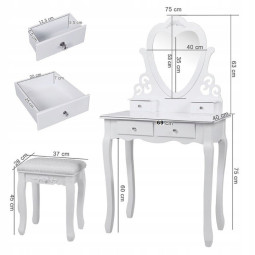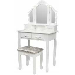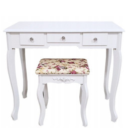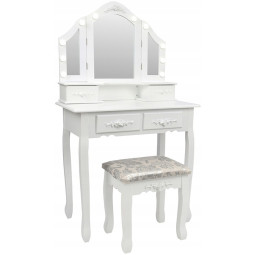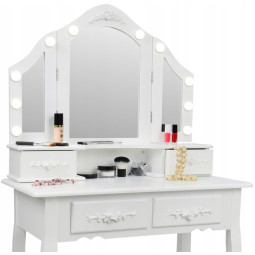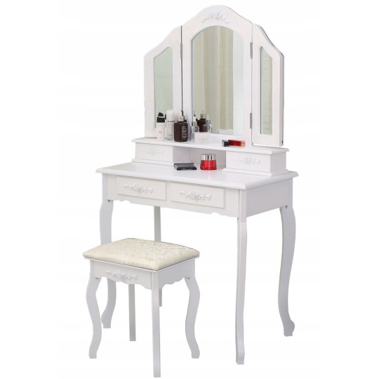 Krásný toaletní stolek na profesionální i amatérské použití pro dámu, která ocení pohodlí a eleganci ve svém domově. Součástí je kosmetický toaletní stolek s pohyblivými zrcadly a pohodlnou židlí. Prostorné 4 zásuvky se zdobenými úchytkami pojmou vše potřebné náčiní a zkrášlující doplňky.