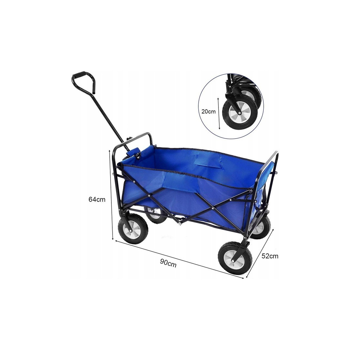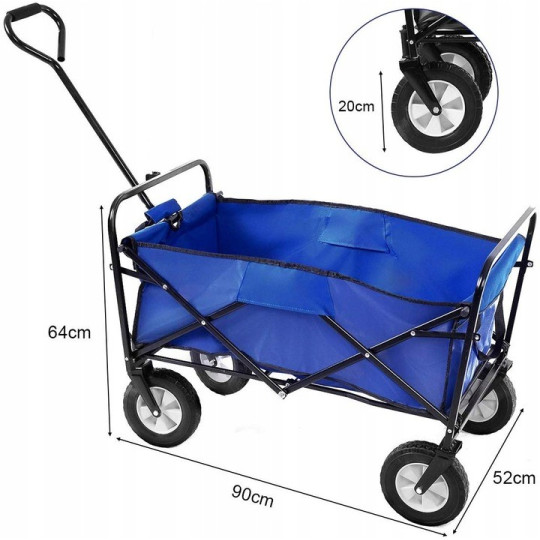 Víceúčelový odolný vozík se skvěle hodí na práci na pozemku či domácí zahradě, vyplatí se ho vzít s sebou i na dovolenou - na pláž, do kempu nebo do lesa. Umožňuje přepravovat všechny druhy malých nákladů. Vozík je vyroben z kovového rámu a voděodolného materiálu. Má pohodlnou a širokou rukojeť, díky protiskluzové rukojeti pro vás nebude problém s přepravou. Kola otočná o 360⁰ zajišťují hladkou jízdu i na písčitém povrchu.