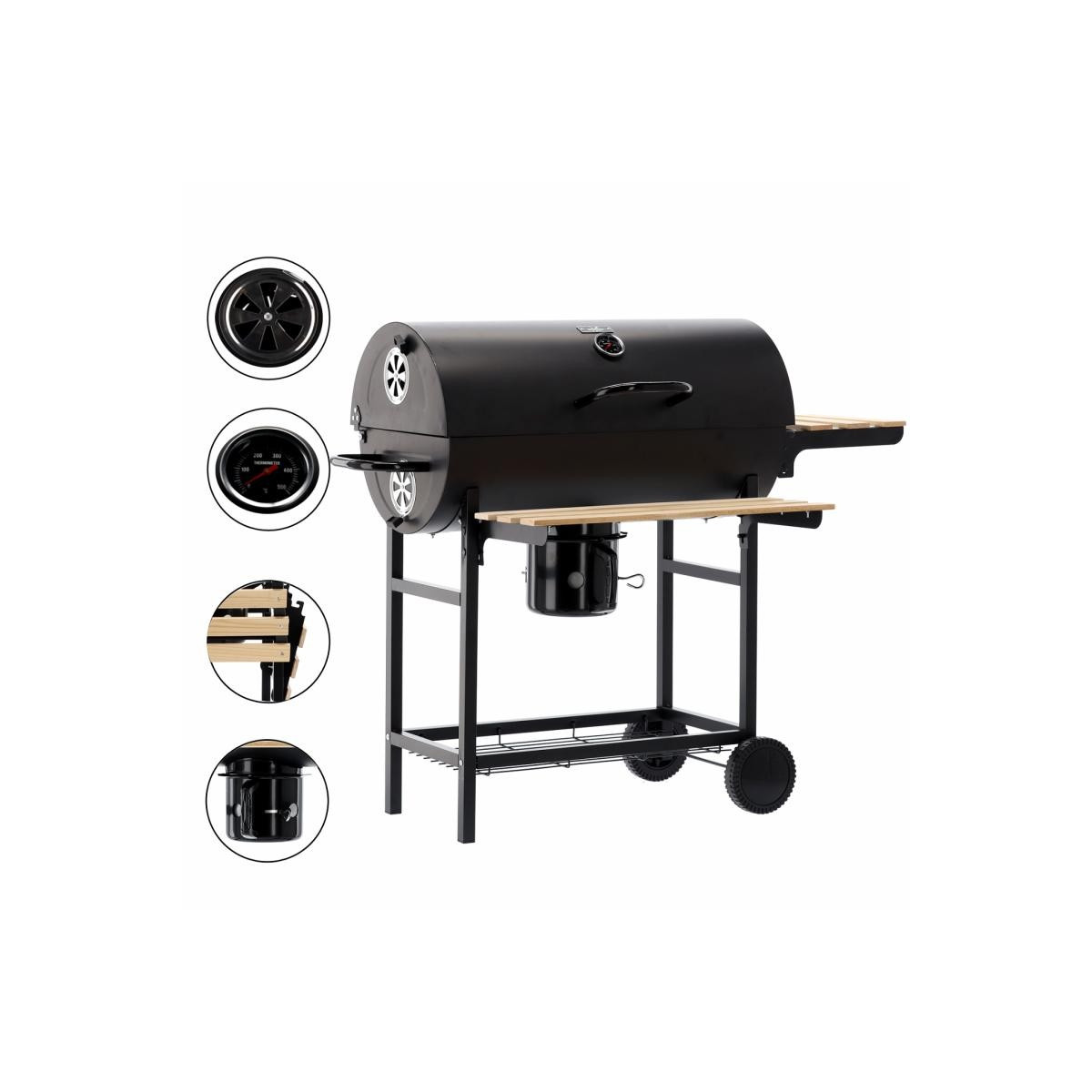 Gril je vybaven dvěma kolečky vyrobenými z odolných materiálů. Umožňují jeho bezpečné umístění kdekoli v zahradě. Gril navíc obsahuje praktickou polici, díky čemuž je ještě funkčnější.